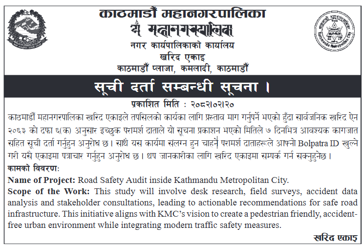 सडक प्रणालीलाई सुरक्षित, आधुनिक र पैदलयात्रीमैत्री बनाउने उद्देश्यले अध्ययन गर्न परामर्शदाताका लागि महानगरले बोलपत्र खुलाएको हो ।